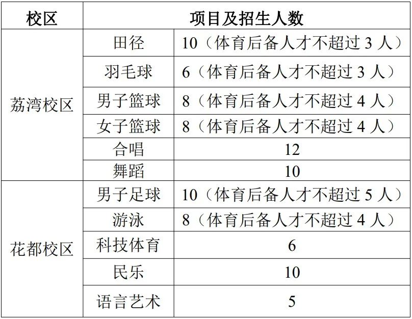 为深入贯彻党的教育方针,全面推进素质教育,加强学校体育、艺术特色教育,2024年我校荔湾校区和花都校区高中将招收一定数量的体育、艺术特长生。